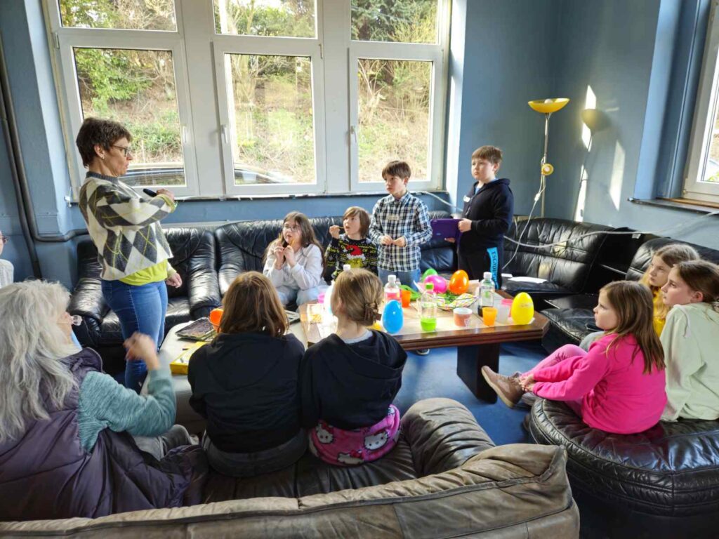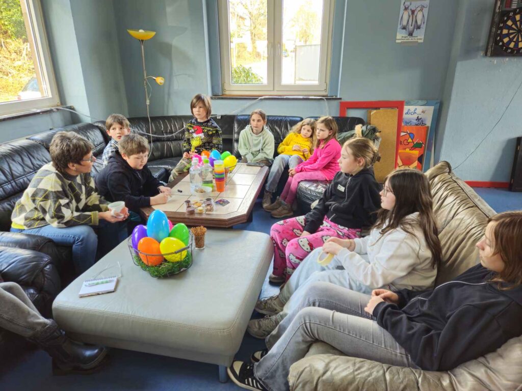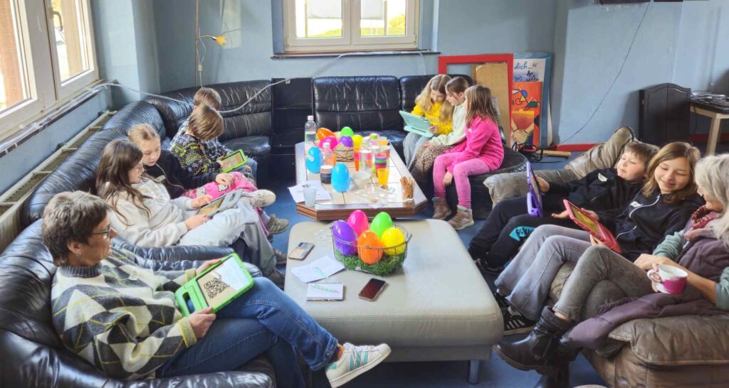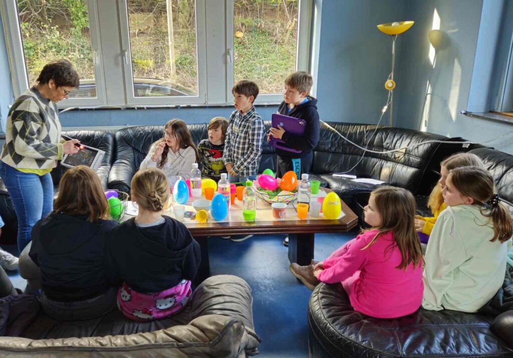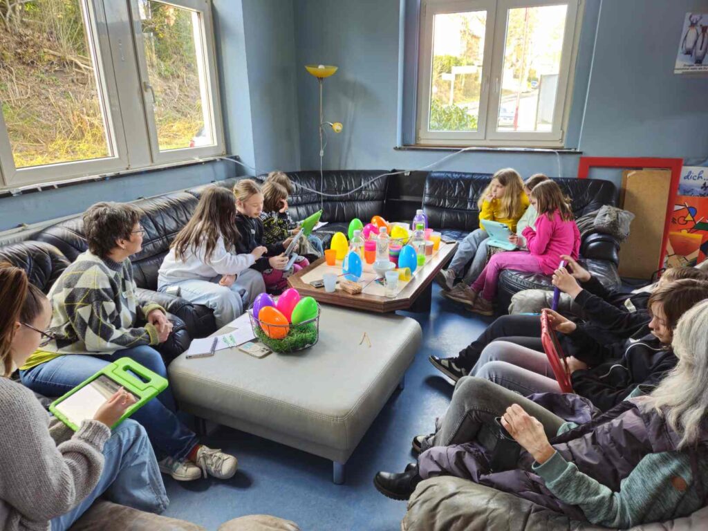 Medienkompetenz war das Thema am Freitagnachmittag vor den Osterferien. Statt Kidstreff, stand im Jugendbahnhof „Ach du dickes Ei…Medienthemen aus dem Ei gepellt“ auf dem Programm. Das kindgerechte Medien-Infotainment für Kids ab 8 Jahre in Kooperation mit dem Kreisjugendschutz wurde angeboten von Michaela Weiß von Medien-Leuchtturm ( www.medien-leuchtturm.de ). Sie setzte sich gemeinsam mit den Kindern mit wichtigen Themen im kindgerechten Umgang mit Internet und Handy auseinander. Diese fanden die Kinder als Aufgabenzettel mit spannenden Inhalten in großen Ostereiern. So gab es Überraschungseier mal anders. Egal ob Cyber-Mobbing, Fake News, KI, Apps, Wichtige Passwörter, Cyber-Grooming, oder andere Jugendschutzthemen, gemeinsam wurde im kindgerechten Austausch überlegt, wie ein gutes Miteinander funktionieren kann und wie ein geschützter, sicherer Umgang mit den Medien möglich ist. Jede und jeder trug seine Ideen bei, so auch bei verschiedenen Spiele-, Unterhaltungs- und Lern-Apps, die die Kinder gemeinsam auf Tabletts ausprobierten.