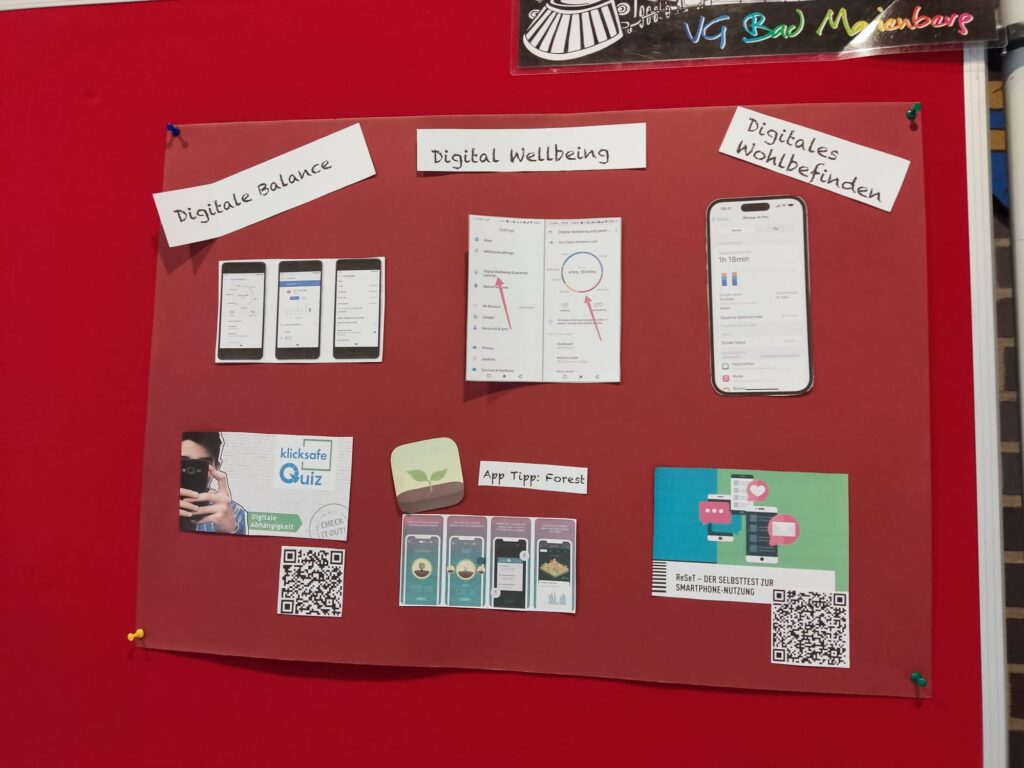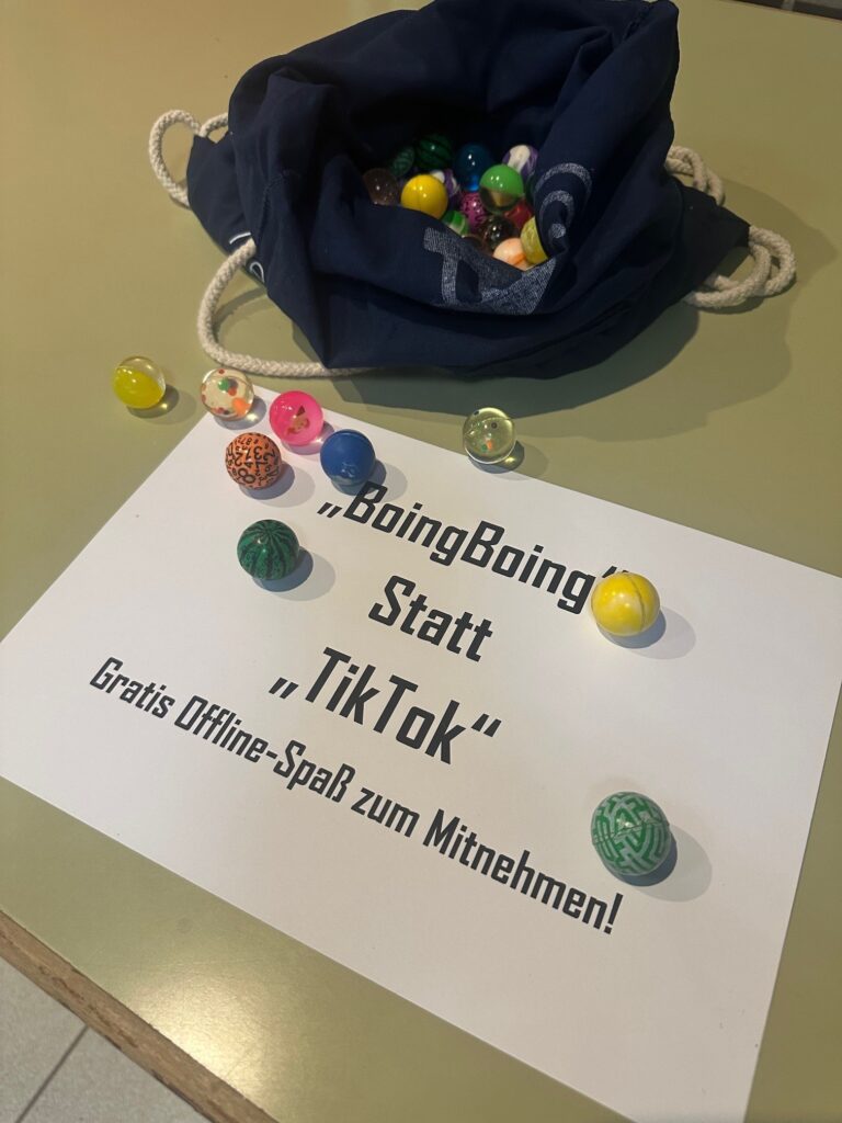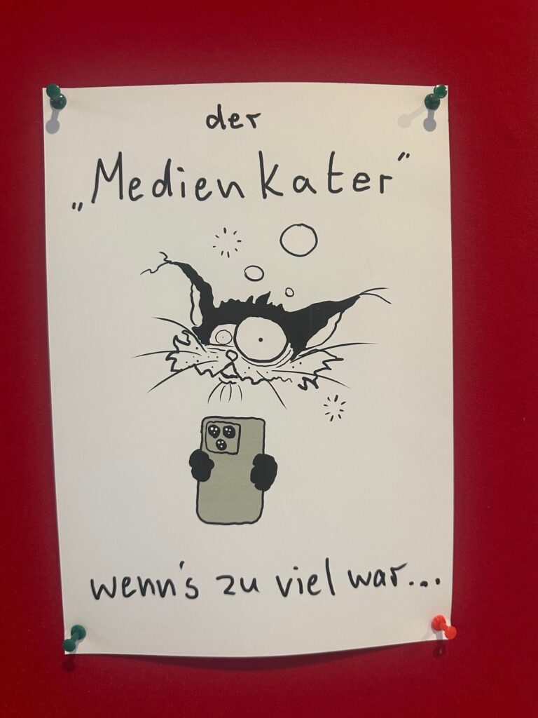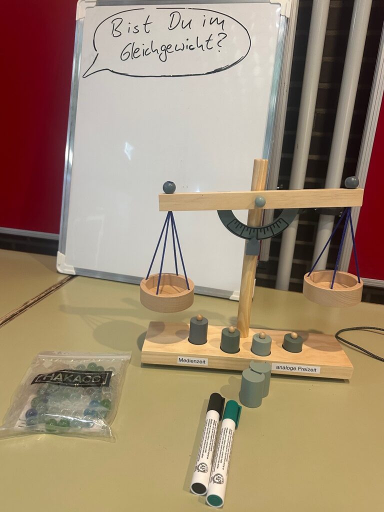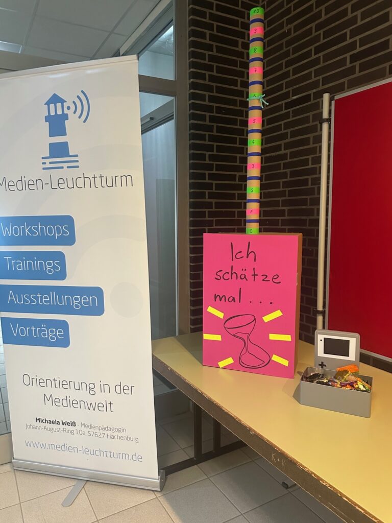 Tatkräftige Unterstützung am Infostand gab es von engagierten jungen Menschen, durch die sich interessierte Schülerinnen und Schüler, befragt von Gleichaltrigen im Selbstversuch, der Selbsteinschätzung bezüglich des eigenen Freizeitverhaltens und Medienkonsums stellten. So gelang es im spielerischen Vermitteln zu motivieren zu Reflexion des eigenen Verhaltens und Inspiration und Impulsgebung bezüglich Alternativen zu Medienkonsum 24/7.