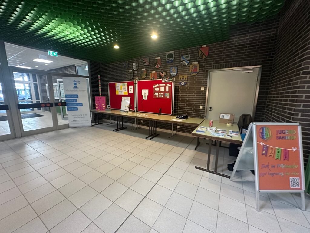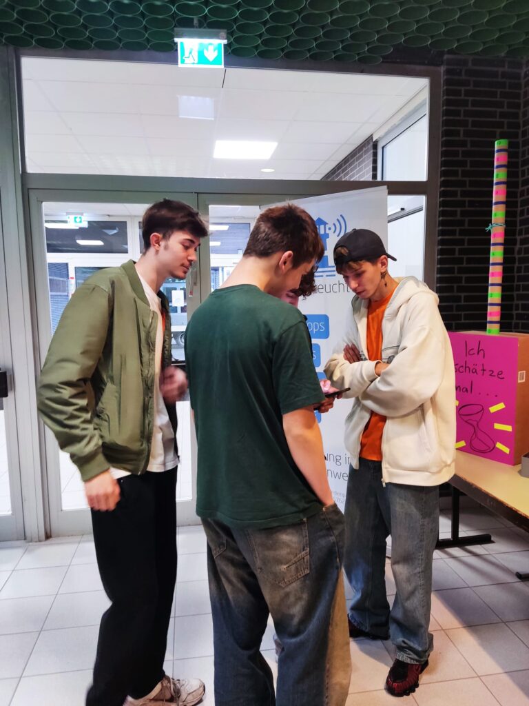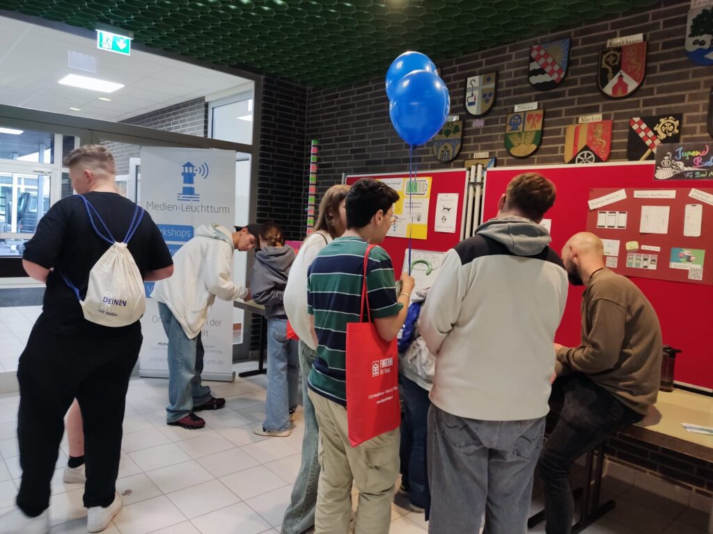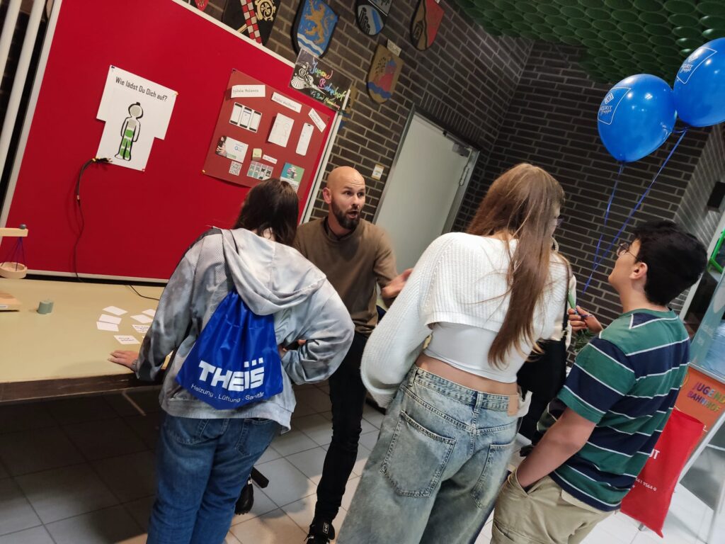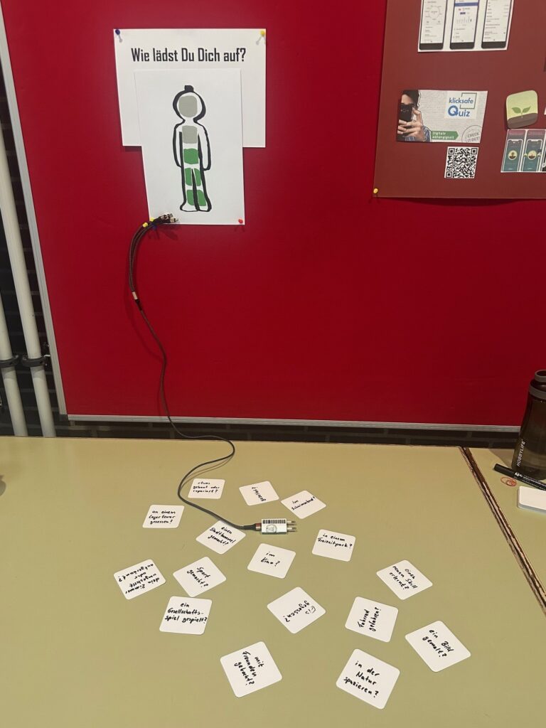 Tatkräftige Unterstützung am Infostand gab es von engagierten jungen Menschen, durch die sich interessierte Schülerinnen und Schüler, befragt von Gleichaltrigen im Selbstversuch, der Selbsteinschätzung bezüglich des eigenen Freizeitverhaltens und Medienkonsums stellten. So gelang es im spielerischen Vermitteln zu motivieren zu Reflexion des eigenen Verhaltens und Inspiration und Impulsgebung bezüglich Alternativen zu Medienkonsum 24/7.